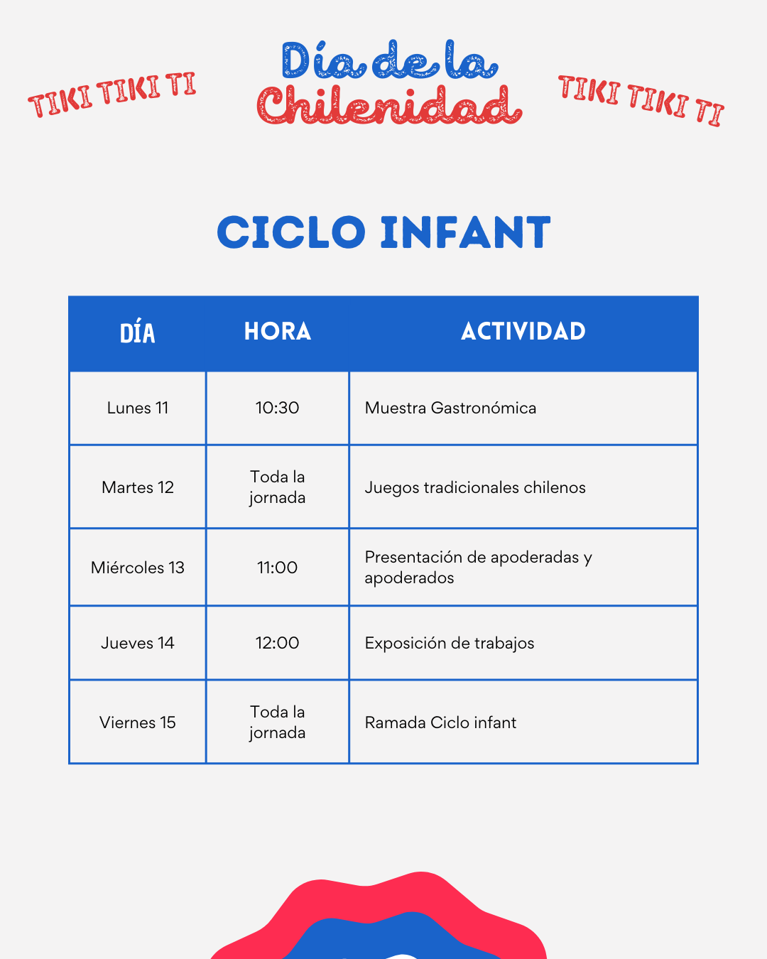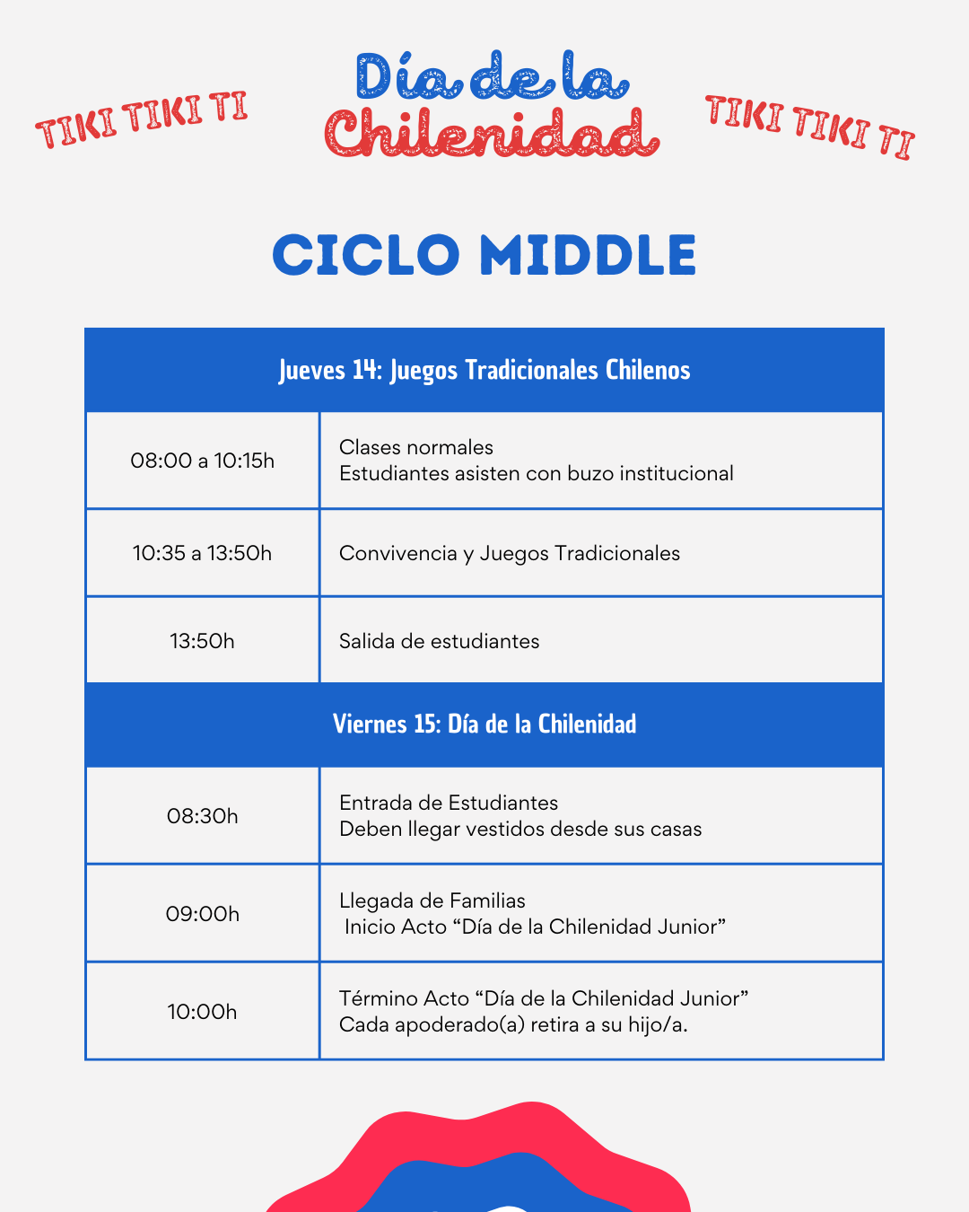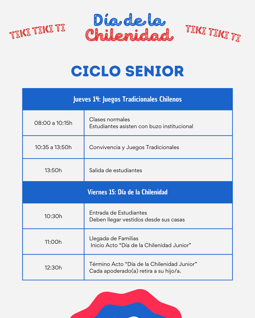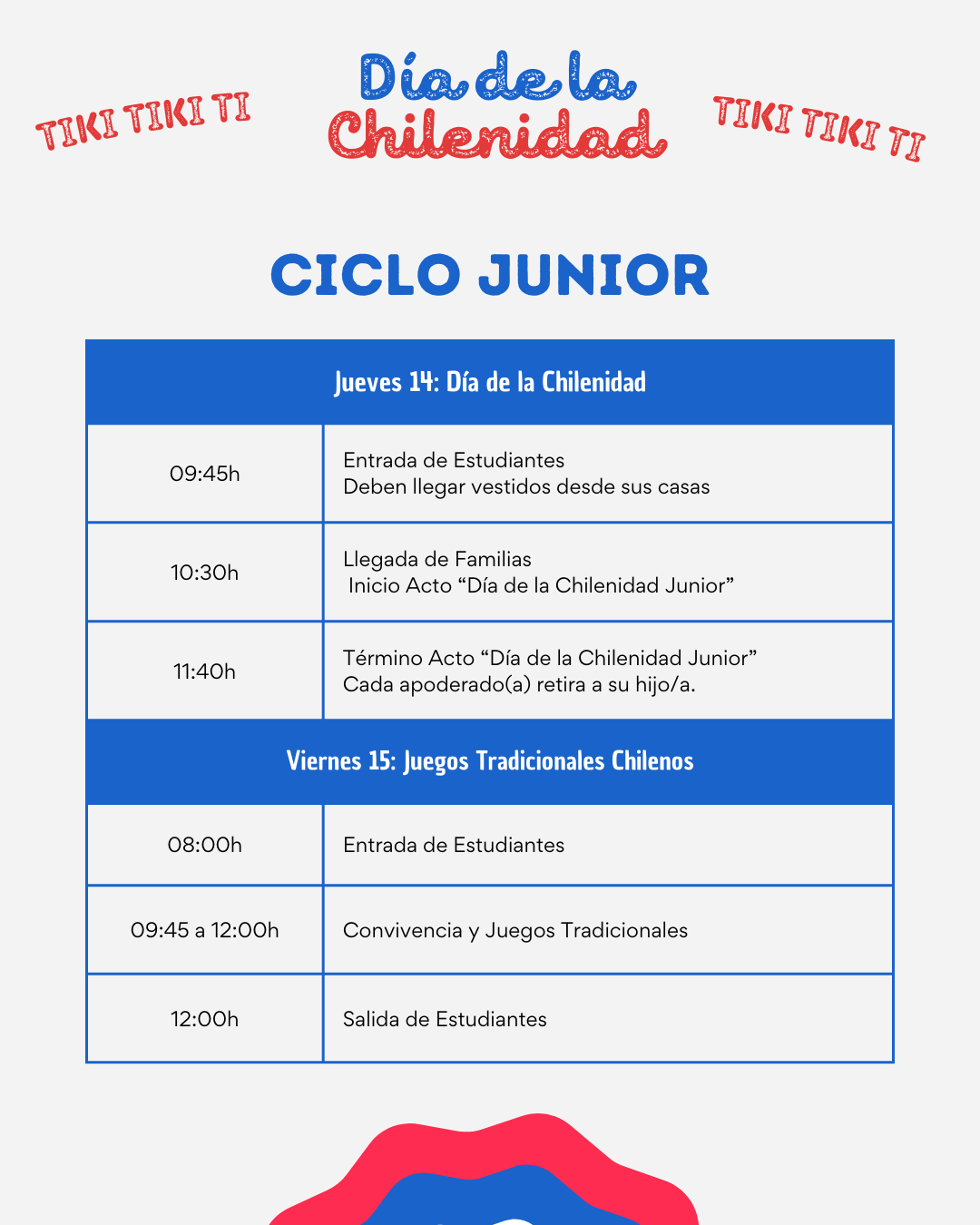 Junto con saludarles, informamos a Uds. que el próximo jueves 14 y viernes 15 de septiembre, celebraremos “ El Día de la Chilenidad y Juegos tradicionales 🇨🇱 “ en los Ciclos Infant, Junior, Middle y Senior. Para ello hemos contemplado algunos cambios en la jornada habitual, por las actividades programadas para esos días.