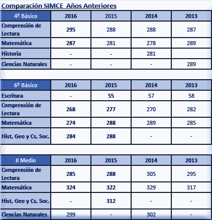 En las siguientes tablas se presentan los resultados de los últimos 4 años. En ella se puede apreciar el aumento progresivo en 4° básico, en sexto un descenso que nos preocupa y en II medio hemos mantenido los resultados, si bien en lenguaje aparece una baja, la verdad es que el promedio nacional también baja.