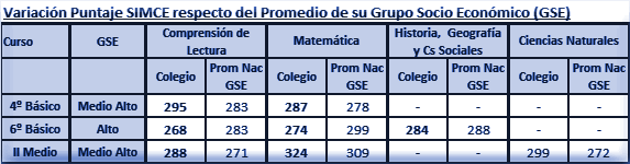 En la tabla siguiente se presentan los resultados en comparación con el promedio de los grupos socioeconómicos con los cuales se nos compara, a raíz de las encuestas que los apoderados llenan los días de toma de la prueba. En 4° y II medio nuestro colegio fue clasificado como Medio Alto, en cambio en 6° fue clasificado como Alto. Esto nos compara con los colegios de elite de Chile y nos perjudica al momento de la comparación. En los niveles de 4° y II medio estamos por sobre el promedio.