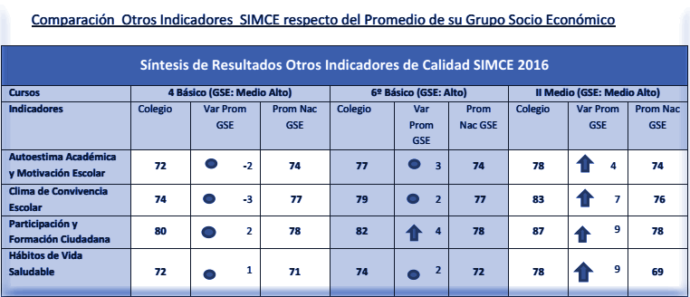 A continuación se presentan los resultados de los Otros indicadores de Calidad que se miden a través de encuestas que responden los apoderados y también los mismos estudiantes. Los resultados de nuestro Colegio son similares al promedio del grupo socioeconómicos en 4° básico, y superan al promedio en los cursos superiores, lo que nos deja satisfechos como Colegio.