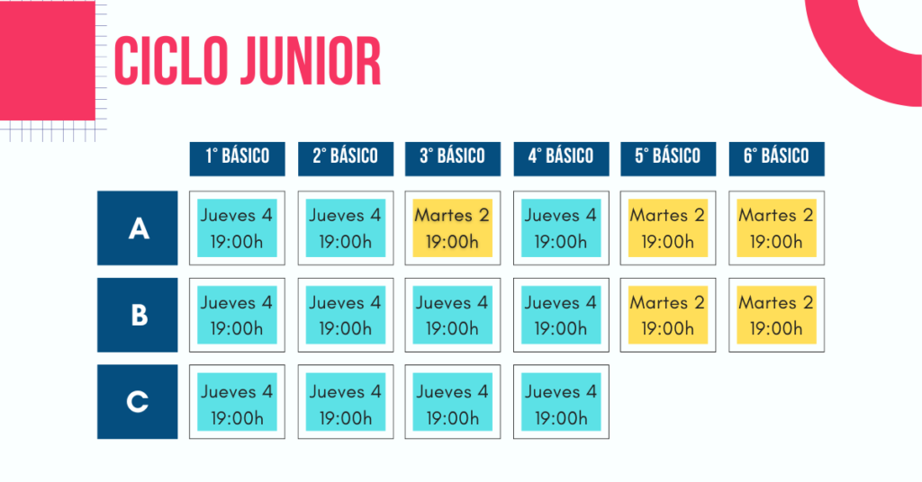 Queridas Familias: La próxima semana, se realizarán las primeras reuniones de apoderados/as. Todas las reuniones serán en las sedes y salas respectivas.