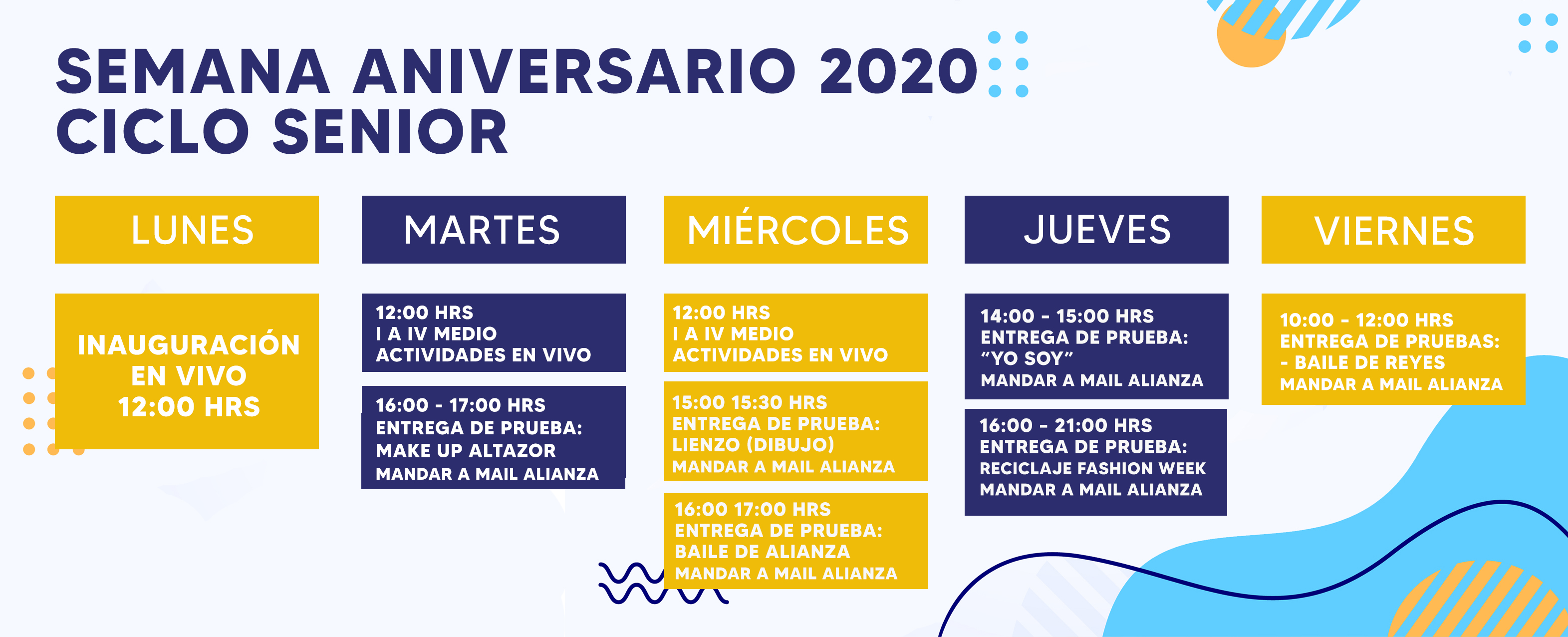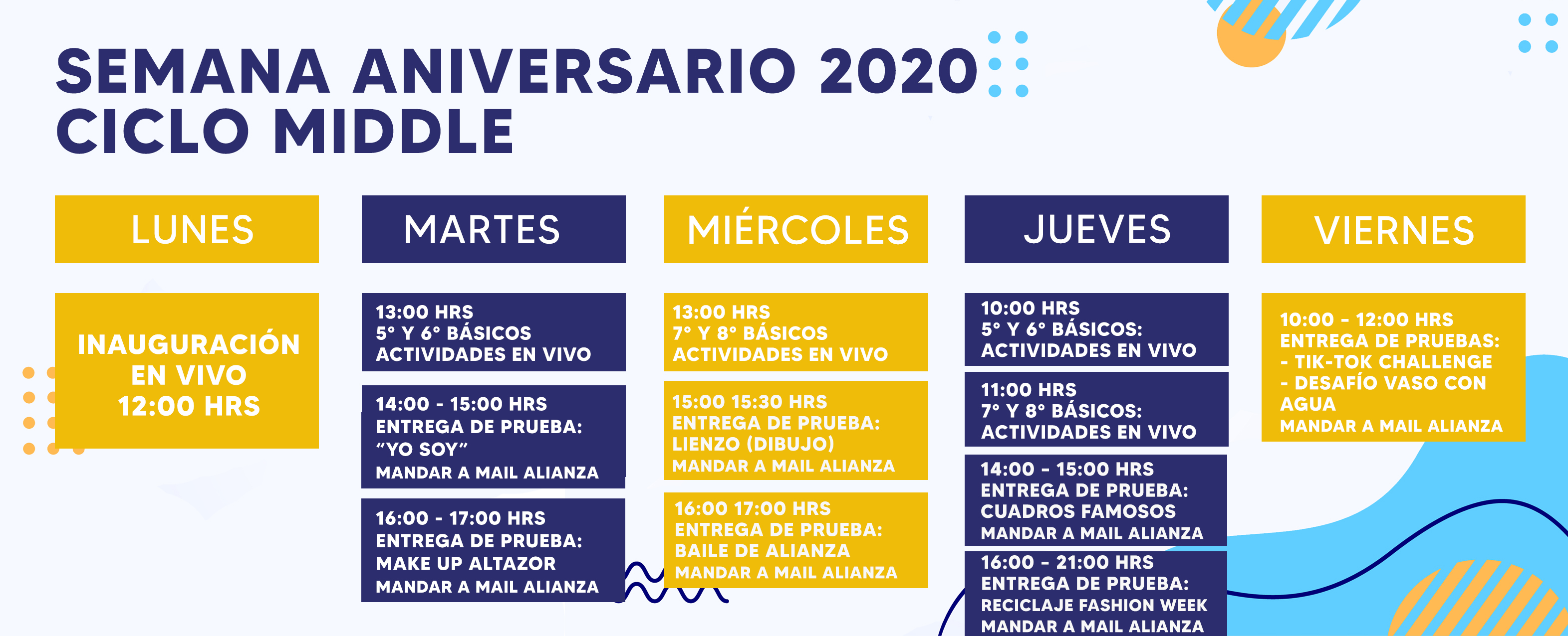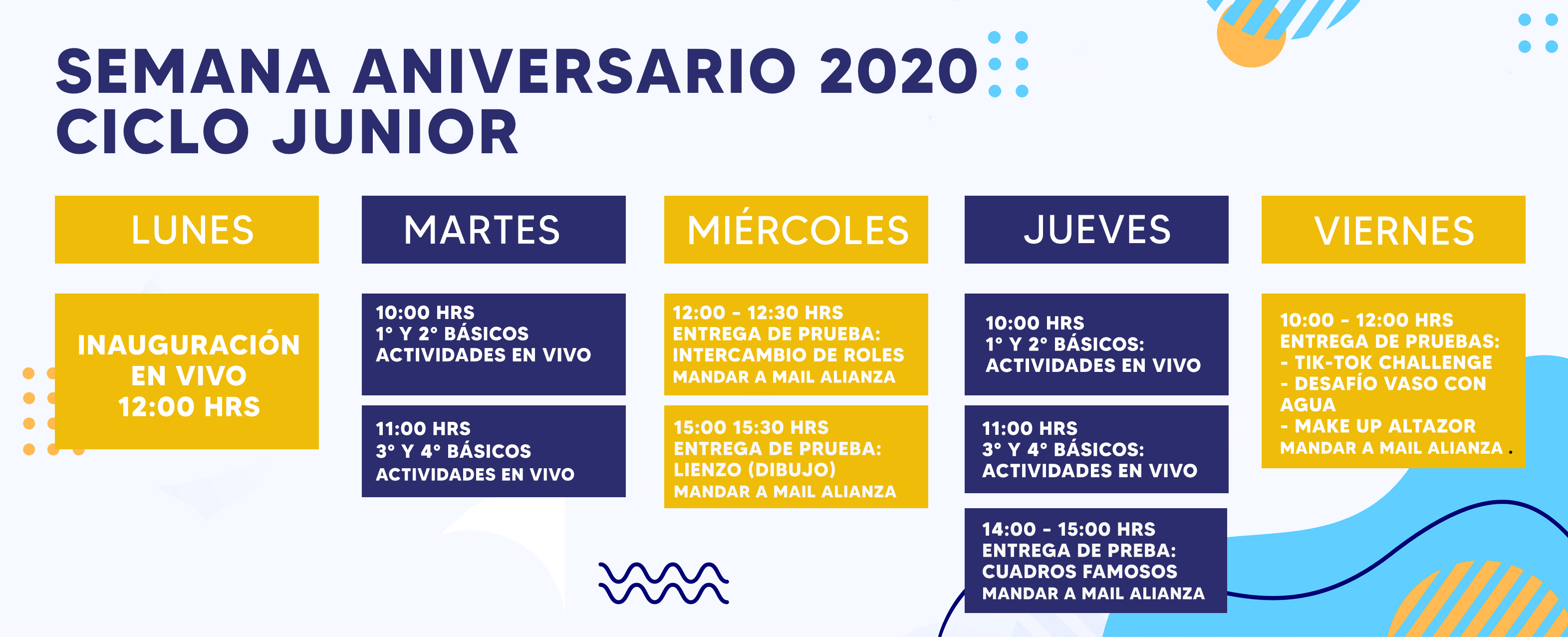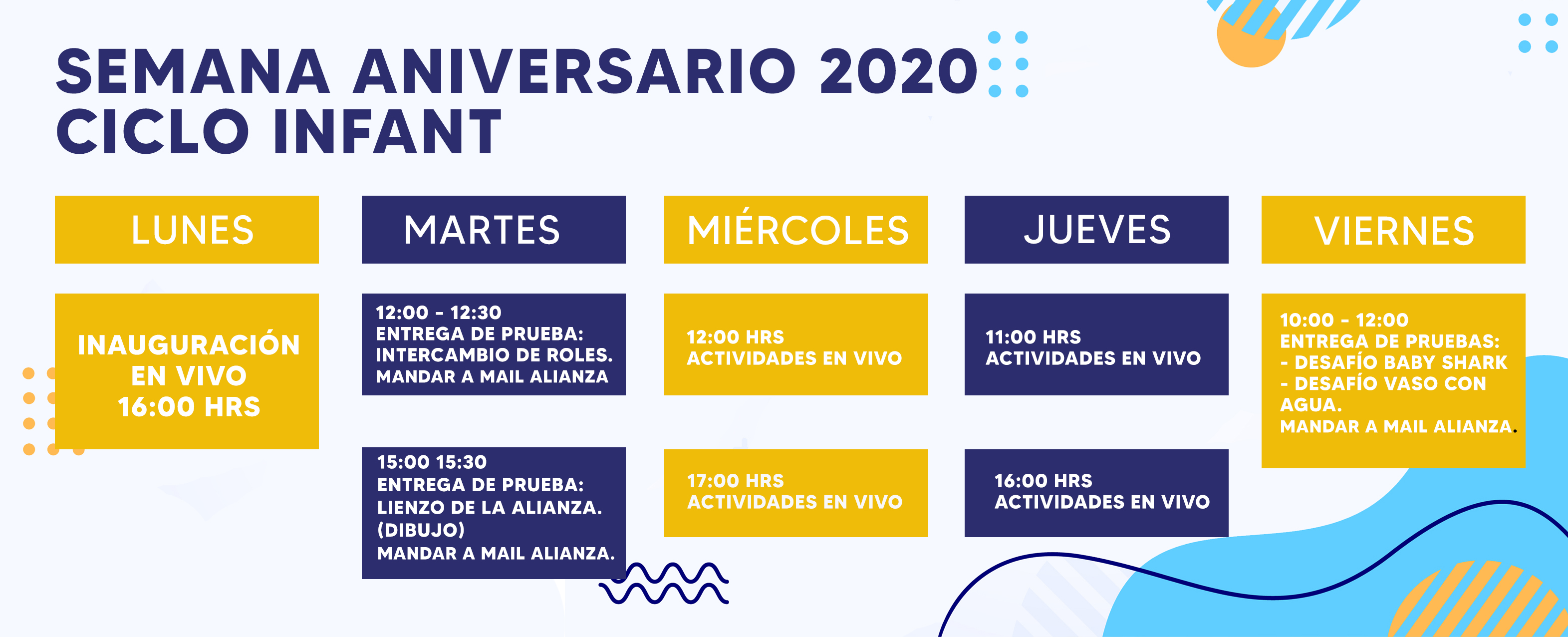 A partir del día lunes 26 al viernes 30 del presente mes, se realizarán distintas actividades junto a las alianzas en todos los ciclos. Habrán pruebas en vivo (zoom), pruebas que tendrán que enviar a los correos de alianzas y actividades internas de cada ciclo.