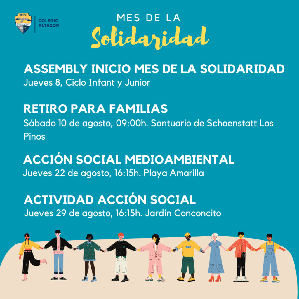 Agosto es un mes especial en nuestro colegio, dedicado a promover la solidaridad y el compromiso con nuestra comunidad. ❤️ Durante este mes, hemos preparado una serie de actividades que nos invitan a vivir el valor de la solidaridad en nuestras acciones diarias. ¡Te invitamos a participar y ser parte del cambio! 🌟